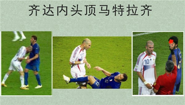 案例四:这是2006年德国世界杯决赛,对阵双方是法国和意大利,在图中事件发生之前,法国队的齐达内开场就利用点球帮助法国队取得领先,马特拉齐随后为意大利扳平比分。当比赛进行到109分钟时(这已经是加时赛阶段了),马特拉齐后场盯防齐达内,两人发生口角,齐达内丧失冷静,头顶马特拉齐,马特拉齐应声倒地(当然不免有演的成分),裁判直接红牌送法国队长出场。结果大家都知道,那年的大力神杯最终归属意大利队。可以说,齐达内的不冷静行为,直接影响了后面的比赛走势。