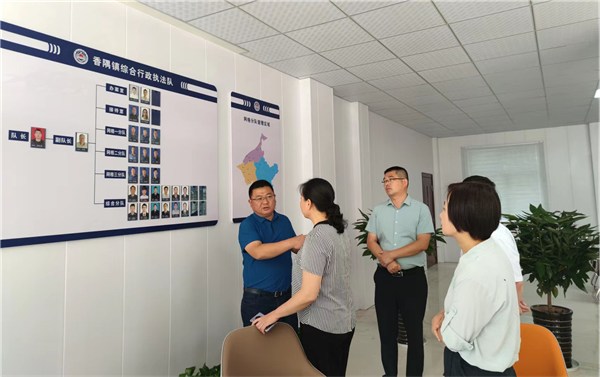 在香隅镇综合行政执法大队,工作人员向评估组介绍了综合行政执法大队的人员构成和工作运转情况,评估组就乡镇综合执法队伍建设和建立健全综合行政执法工作机制提出具体指导意见。
